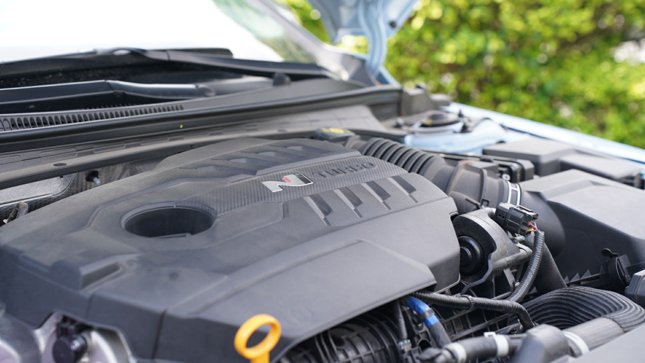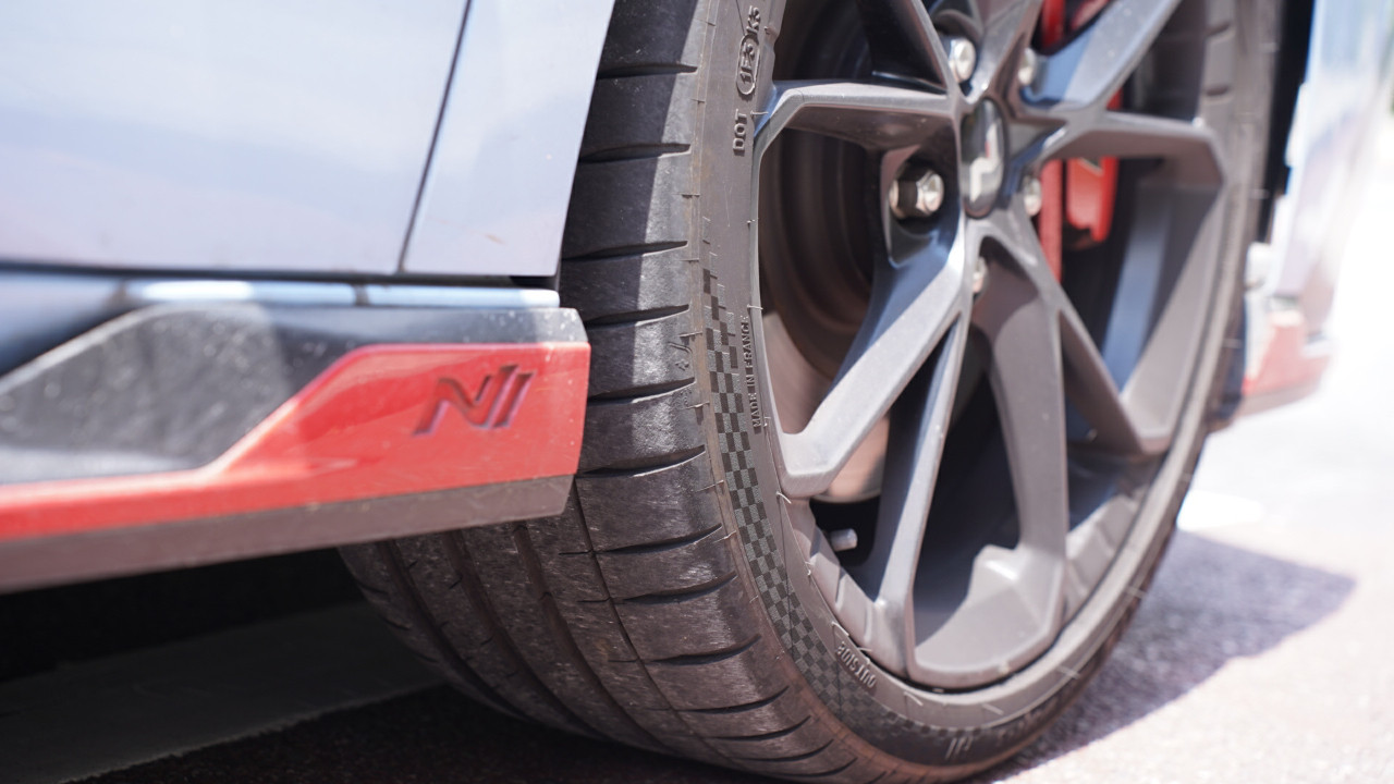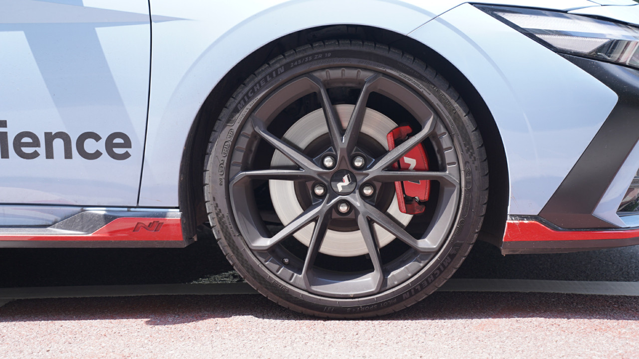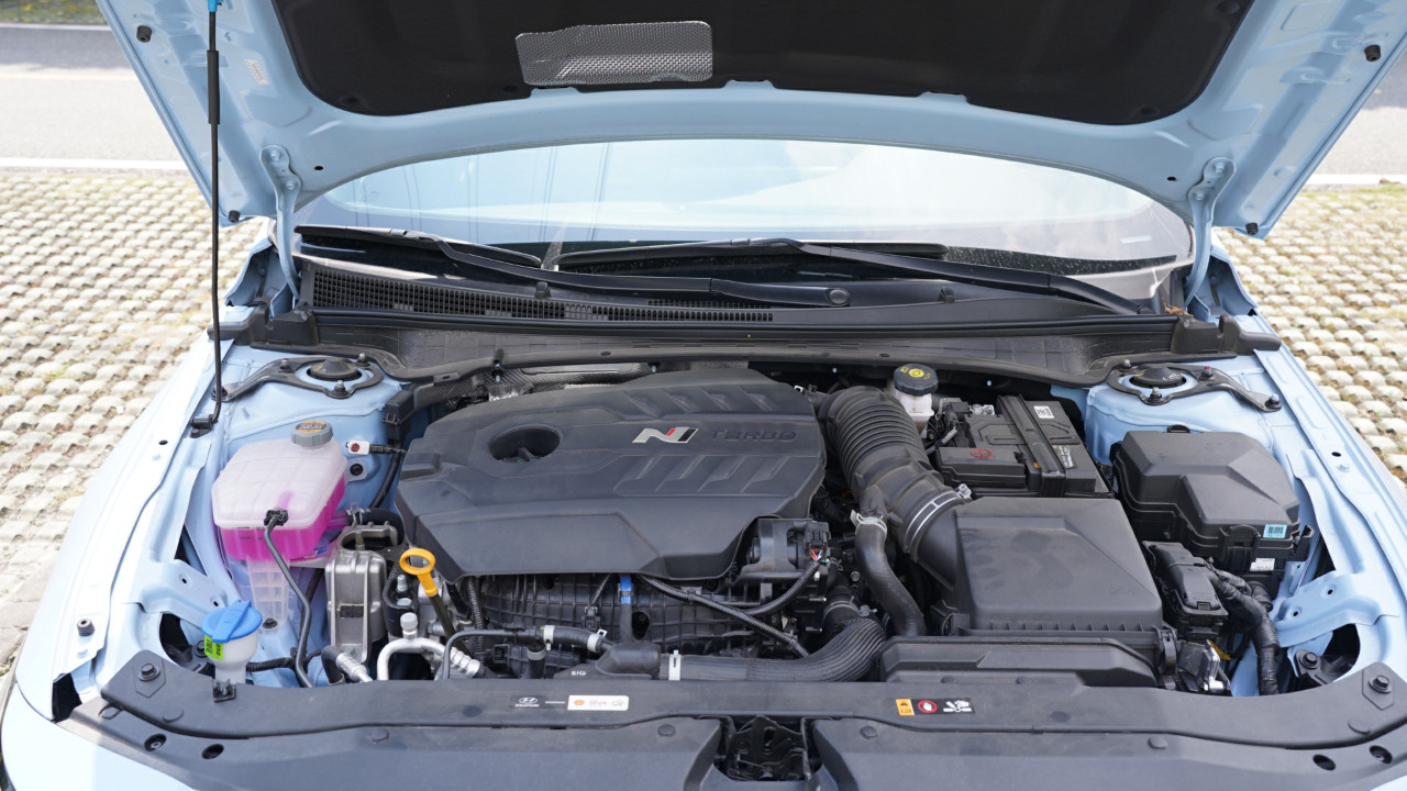 我试驾的这台车,叫现代伊兰特N,是现代N这个高性能车家族下的代表车款。这台车上市于2023年11月,是一台纯燃油车,账面动力参数其实并不算很出众,一台2.0T发动机,最大马力276匹,最大扭矩392牛·米,搭配一台8速双离合变速箱。这是一台前驱车,没有四驱版本,前麦弗逊后多连杆悬架,245/35 R19的轮胎,有前桥LSD,零百加速5.3秒。