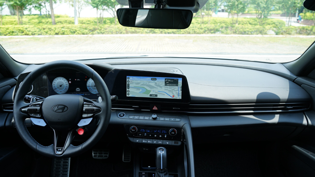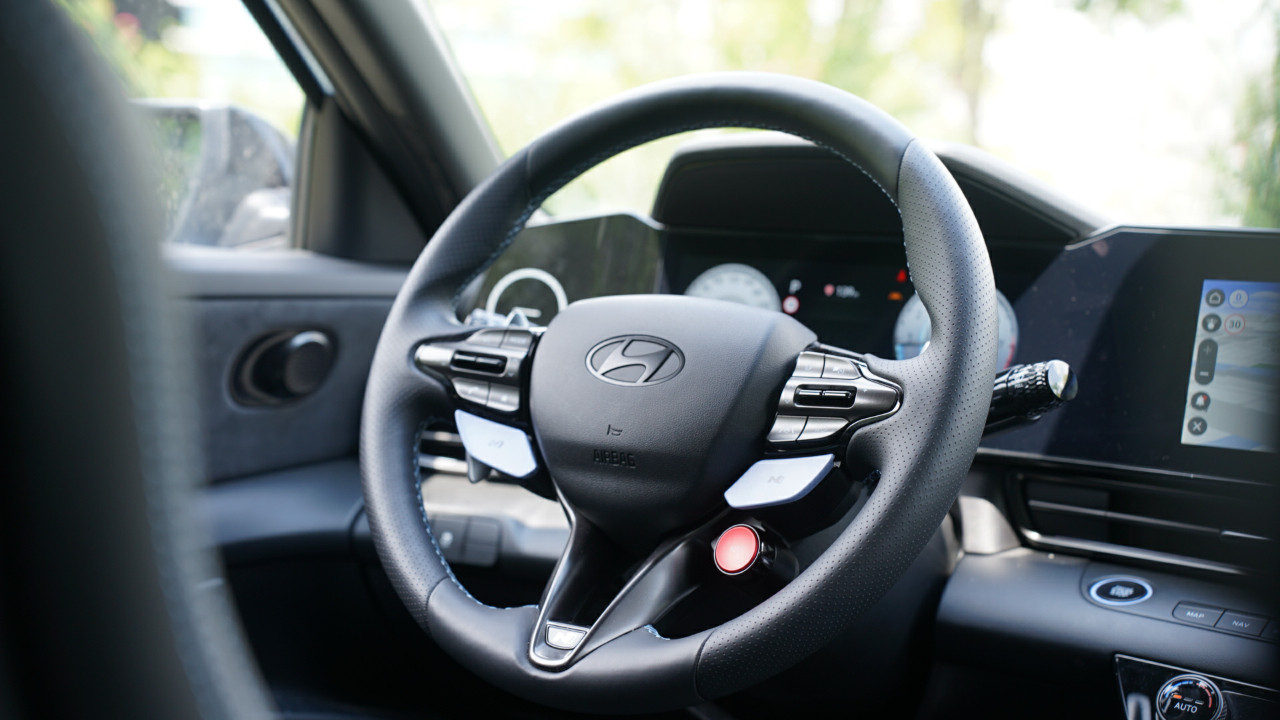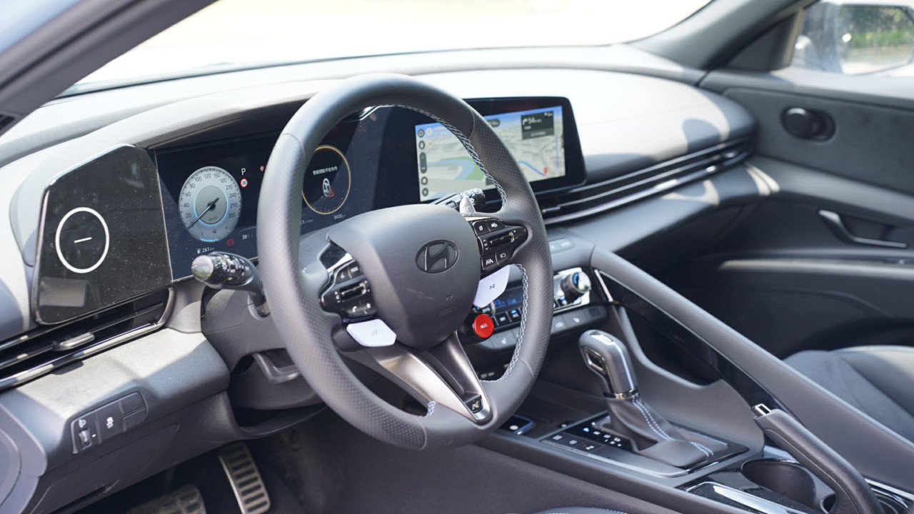 除了座椅给你的强烈包裹感外,当你双手握着方向盘,环顾整个中控台,你会找到那种久违的纯种性能车的感觉。整个中控台明显向驾驶者倾斜。方向盘上大大的红色按钮是现代N模式的按钮,方向盘后面闪着银光的两个换挡拨片,再到方向盘后面那块全数字仪表,一切都在暗示着你,该启动发动机了。