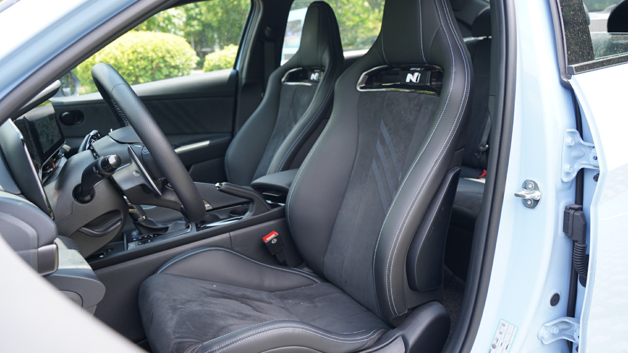 它前排是两张半桶椅,而且驾驶位的那张座椅和副驾的还有点不一样,如果说副驾座椅还能让你的腰部能在座椅中左右移动的话,主驾那张座椅是真的完完全全裹住你整个腰部的。而且伊兰特N前后两排座椅全都是翻毛皮材质,为的就是最大化摩擦力。不过说到座椅,挑个小刺,我们试驾的这台车前排两张座椅都没有打孔,在广州这种中午接近40度的高温下,长时间坐着,屁股是有点热的。如果伊兰特N后续有改款的话,把座椅的面料改为翻毛皮打孔材质,对于长时间乘坐的体验感会好很多。