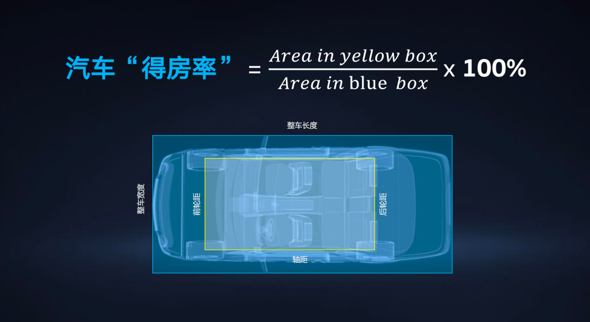汽车的“得房率”就=图中黄色部分面积/以蓝色部分*100%。