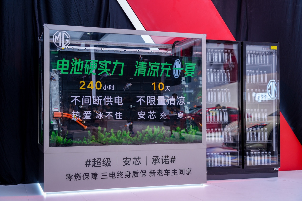 除了重磅新车发布之外,上汽MG名爵展台更是创意满满。夏日酷热难消,冰饮无疑是消暑之选,上汽MG名爵展台为大家准备了清凉的饮料供大家解暑。大家在享受到清凉的同时,惊奇的发现饮料柜的“能量之源”竟然源自一块在水中浸泡的电池。这就是上汽MG名爵的独门绝技——“零燃电池”,即便被水浸泡也依然能够稳定为饮料柜提供源源不断的电力,众多观众纷纷拿起手机,记录下了这“神奇“的一幕,在畅享清凉的同时,还能直观的了解上汽MG名爵“零燃电池”的黑科技以及“超级安芯承诺”的无畏勇气。承载着MG“无惧欧盟关税、出海步履不停”态度的38.1周边互动区域,也是创意十足,极具互动性,引得众多参展观众前来打卡。