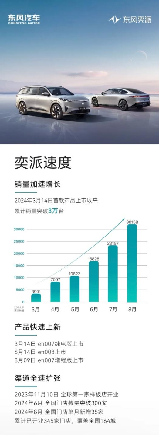 迅猛的产品推新速度和完善的渠道布局,助力东风奕派销量节节攀升。从2024年3月14日首款产品上市以来,东风奕派仅用5个多月,就迎来了累计销量突破3万台的里程碑时刻。