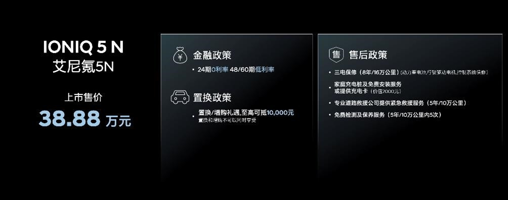 在万众期待中,印庸壹先生正式公布了IONIQ 5 N(艾尼氪5N)的上市价格。其定价为38.88万元,为了满足不同消费者的购车需求,N品牌为用户准备了多种金融方案和优惠的置换政策,其中包含24期0利率以及48/60期低利率两种金融政策,以及为N品牌车主、粉丝及高性能驾驶爱好者特别准备的置换/增购礼遇,至高可抵10,000元。同时,N品牌还公布了安心的售后政策。IONIQ 5 N(艾尼氪5N)将为车主们提供高压电池和电动汽车核心组件长达8年或16万公里的质保服务。同时,N品牌为购车用户提供免费家庭充电桩安装服务,并为无法安装家用充电桩的用户提供2000元的充电卡。 同时售后服务还包括周到的安全服务和基础保障。