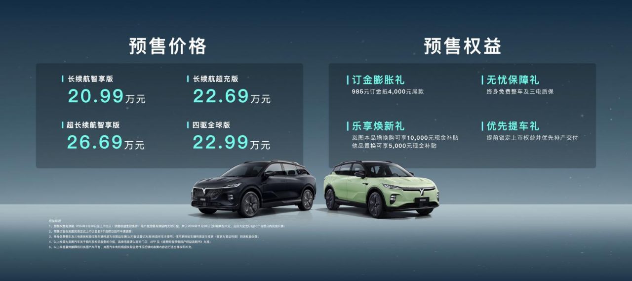 8月30日,岚图旗下高端纯电SUV岚图知音在2024成都车展上正式开启预售,新车共公布4个版本,预售价格区间为20.99-26.69万元。