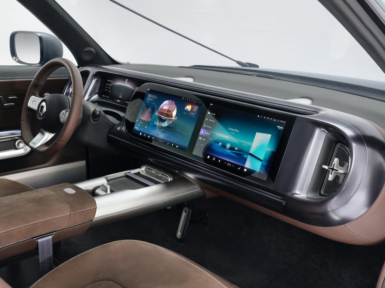 这里还需要提及一个小细节:精灵#5这台车前排一共3块屏幕,其中仪表屏幕是传统的LED光源,而中控屏和副驾屏,全都用的是2.5K分辨率的OLED屏,这块屏幕尽管官方没有明确说明,但现阶段会在中控屏幕上用OLED技术,而且不是通用系那种带鱼屏,而是类似16:9的传统屏幕的,几乎只有奔驰一家。所以我们不好说,精灵#5这两块屏幕,是不是和奔驰EQ系列的高端车型有些相似之处。