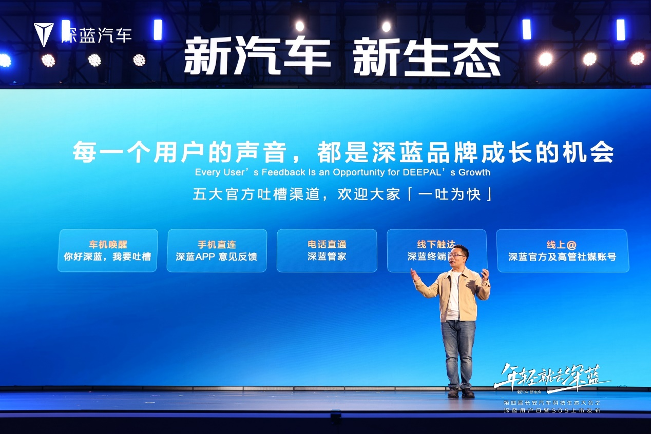 深蓝汽车始终以用户需求为导向,此次活动现场,更是把用户“吐槽”搬上了舞台,通过现场采访直接展示用户反馈,在大屏幕上滚动播出用户的建议与“吐槽”。深蓝汽车CEO邓承浩直面用户“吐槽”,并给出解决方案。