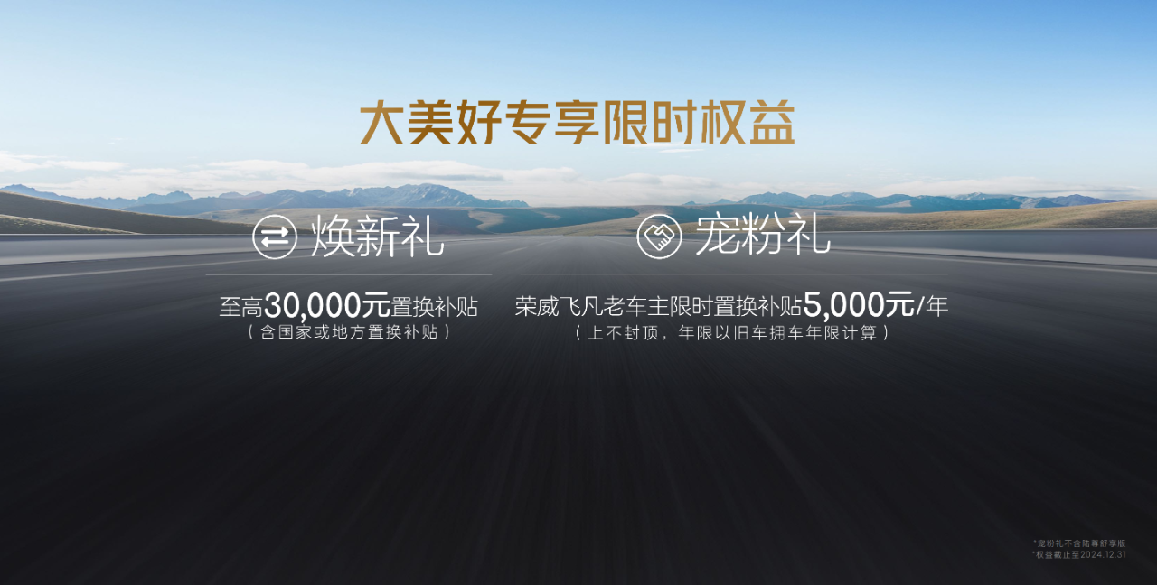 此前,上汽荣威就已经推出多项限时超值权益。其中iMAX8 DMH新陆尊特别推出业界领先的“以旧换新”置换政策——依照拥车年限计算,每年享受5000元的置换补贴,上不封顶(陆尊舒享版除外)!同时新购入车主也可尊享行业独有的3年8折保值回购计划,日均拥车成本低至31元。此外,iMAX8 DMH新陆尊和D7 DMH世界冠军版还享受国家/地方置换补贴、零自燃终身质保及赠送充电桩等多项超值权益。