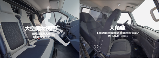 座舱空间大,1.88米的高个用户也不会压抑。E福顺还配备了行业少有的前排纯平三人座,更能满足用户的实际需求。E顺达副驾躺卧角度可达36°,优于高铁一等座的乘坐享受。同时,驾驶舱还拥有超大视野,标配怀挡和电子助力转向,还可配倒车影像,夫妻俩切换开车也完全没问题。