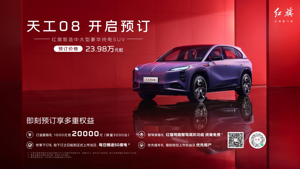 天工08的预订权益可谓诚意十足。消费者即刻下订立享优先提车权益,下订之日起至上市发布,可立享每天50度电的优享下订权益。在此之上,所有预订用户限时赠送红旗司南智驾系统,且L2.9高阶智驾终身免费使用。最为重磅的是,即刻下订还可享受1000元抵扣2万元的订金膨胀权益,限时限量,先到先得。天工08的入门车型即可满足用户日常用车的高频需求,这样一款诚意满满的超值车型,预订起售价仅为23.98万元!