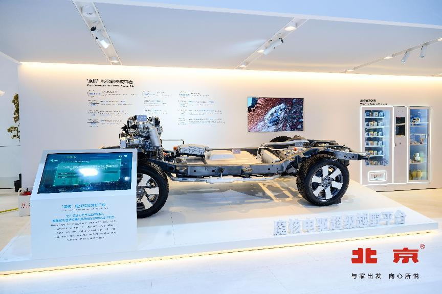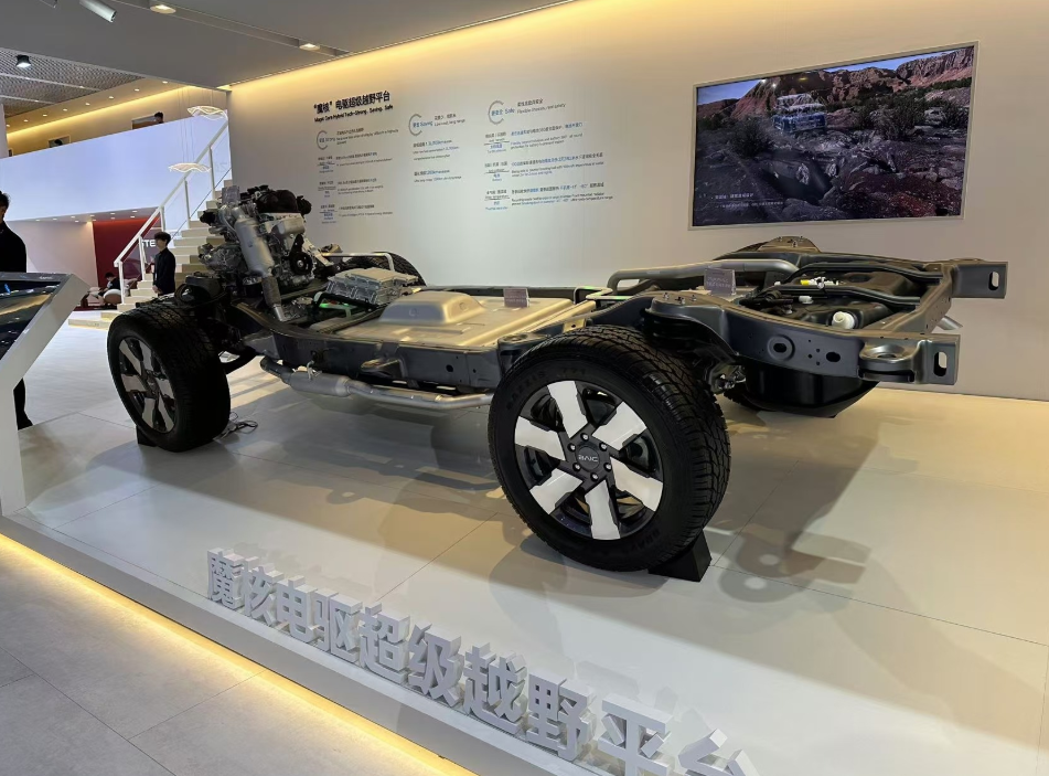 为啥插混车能越野?为啥有这么高的改装潜力?答案都在这了,北京汽车的魔核电驱越野底盘,目前市面上为数不多的有强大越野能力的新能源底盘。大家可以看到,电池是位于底盘中央的,而且安装位置很高,完全不用担心越野时会刮到电池。