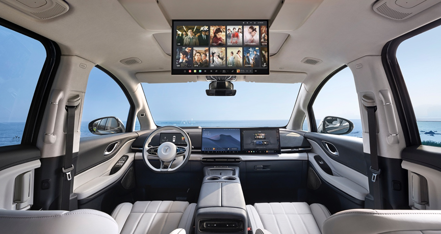 全新岚图梦想家在豪华舒适方面同样不遗余力,车内采用了8屏互动设计,包括AR-HUD、仪表屏、中控屏、副驾屏、双扶手屏、后排娱乐屏以及冰箱控制屏,为用户提供了丰富多样的交互体验。在家庭出行场景中,中控屏、副驾屏及后排娱乐屏可以同步观看视频,让每一位乘客都能享受到沉浸式的娱乐体验。而在主驾驾车场景中,前排中控屏、仪表屏和AR-HUD则能实现导航、智驾和车辆信息的互动显示,提升驾驶的专注度和安全性。