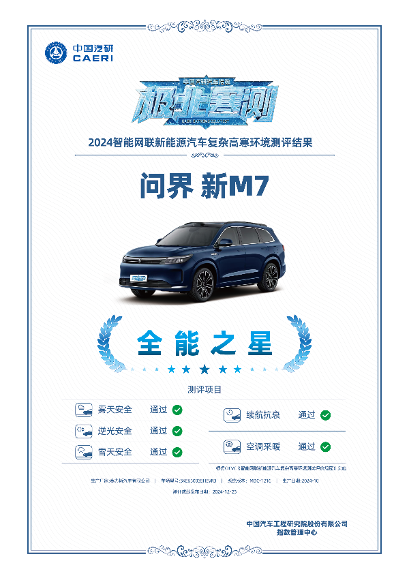 在充满挑战的五大连池问界汽车冬季试验场,一辆辆问界车型完成堪称“地狱难度”的极寒试炼,以可靠的表现,保障用户冬日出行无忧。不久前,中国汽研主办的2024中国汽研汽车指数“极北寒测”暨智能网联新能源汽车复杂高寒环境测试成绩公布,问界M9和问界新M7载誉归来,均以优异的成绩斩获“全能之星”荣誉称号。问界还荣获全场唯一“2024年极北寒测卓越品牌”荣誉称号。
