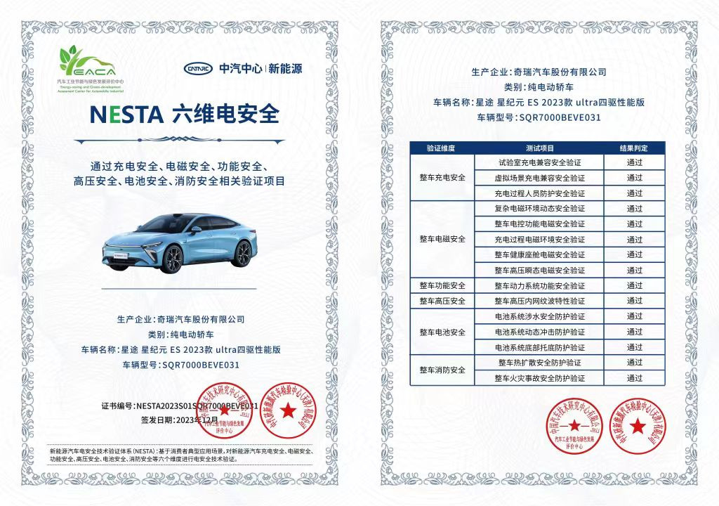 2024 年7月,星纪元ES联合中汽中心完成业内罕见的120km/h超高速三车夹击对撞,结果显示车辆乘员生存空间充足、关键结构件未失效,假人伤害值远低于限值,用户关注的电池包更实现极端碰撞下的零热失控,无位移、无泄漏、不起火、不爆炸。今年5 月 13 日在奇瑞“安全之夜”上,星纪元ES与风云A9L以120km/h相对速度进行无缓冲巅峰对碰,再次印证卓越车身结构在极端碰撞下的出色乘员保护能力,诠释了“安全是豪华的底色,心安之处方为奢”的理念。