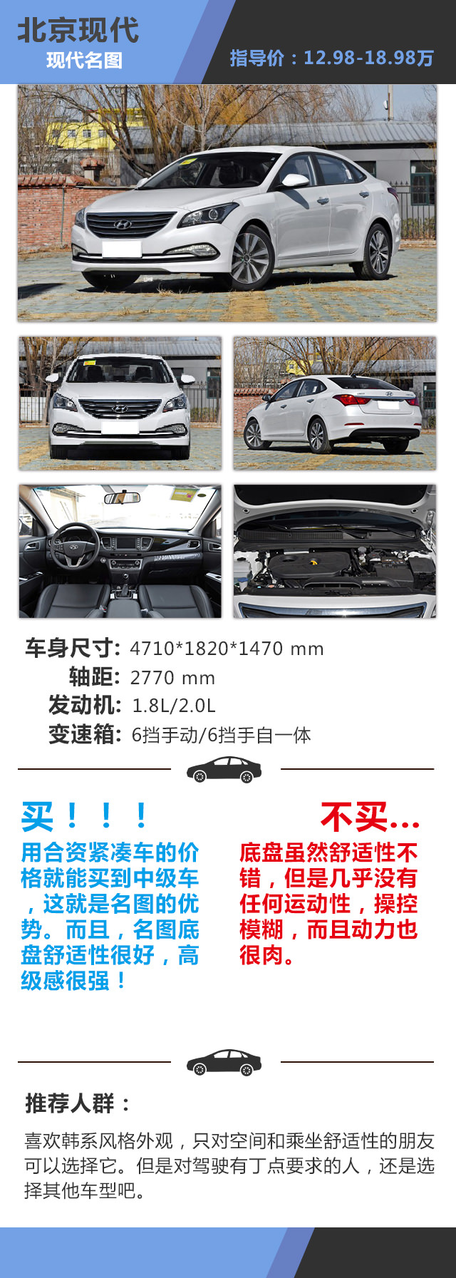 新屌丝三宝只有迈锐宝XL依然在位,说明它的竞争力还是不错的。名图是一辆名副其实的家用买菜车,而速派虽然素质不错,但是品牌力度太低。