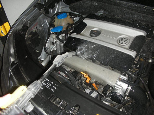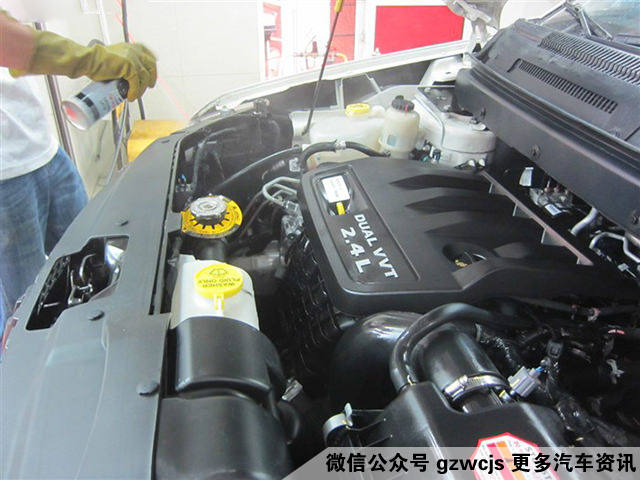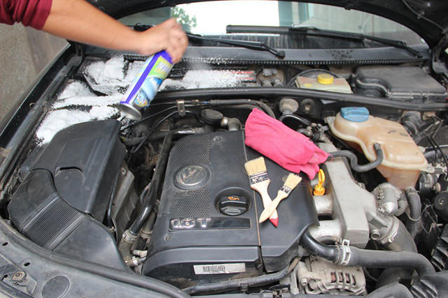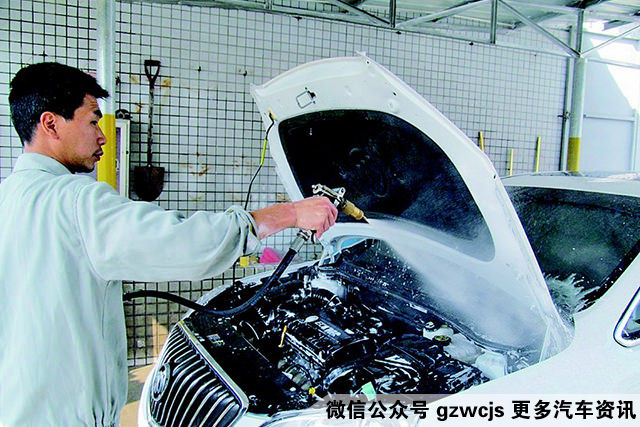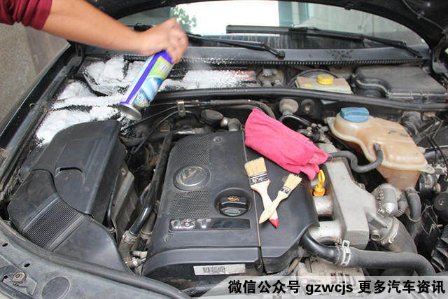 清洗方法就是将发动机外表清洗剂喷在发动机上,然后用小刷子刷洗油迹,等待几份钟以后,用清水冲洗干净,然后使用吸水性能好的布将发动机舱内的水给擦干,也可以着车利用发动机怠速的热量把水蒸干,最后使用线速护理剂(上光剂)喷上一层,完工,一套下来大概需要1小时左右。