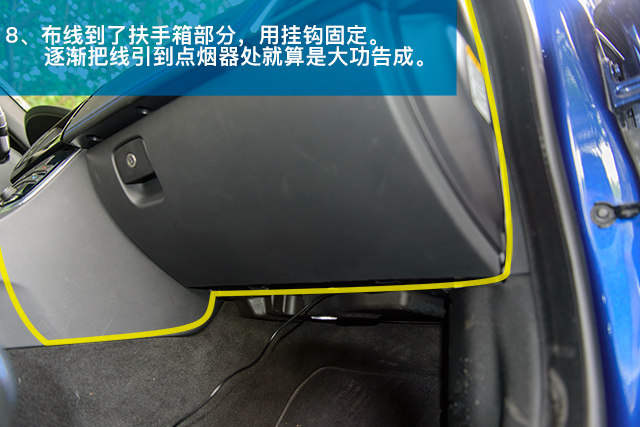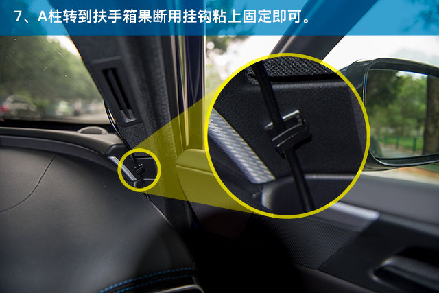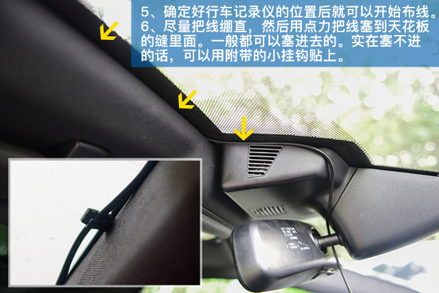 接下来的重点是走线,大部分情况下,都是从右侧走线下来。行车记录仪的电线一般都是能够塞到天花里面,A柱也可以。但再往下到了中控台就不能塞了,不用担心,这个时候可以使用行车记录仪配的小挂钩,逐渐把线引到点烟器处就算是大功告成。