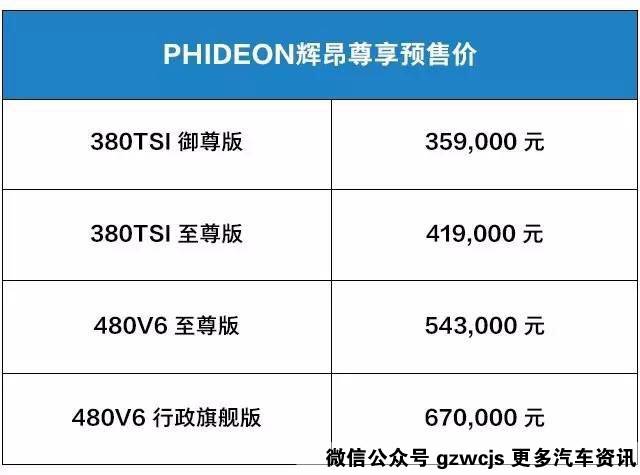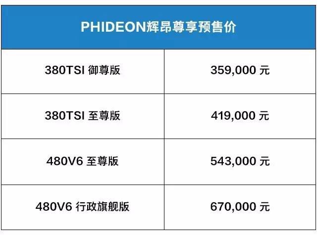 6月4日开幕的深港澳车展上,上汽大众宣布旗下首款C级豪华轿车PHIDEON辉昂尊享预售启动。新车提供380TSI及480V6两款动力选择,结合不同配置,推出御尊版、至尊版及行政旗舰版共计4款车型。