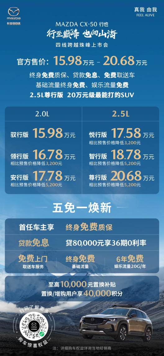 售价15.98万——20.68万元 “山系生活宽体SUV”长安马自达MAZDA CX-50行也成都上市