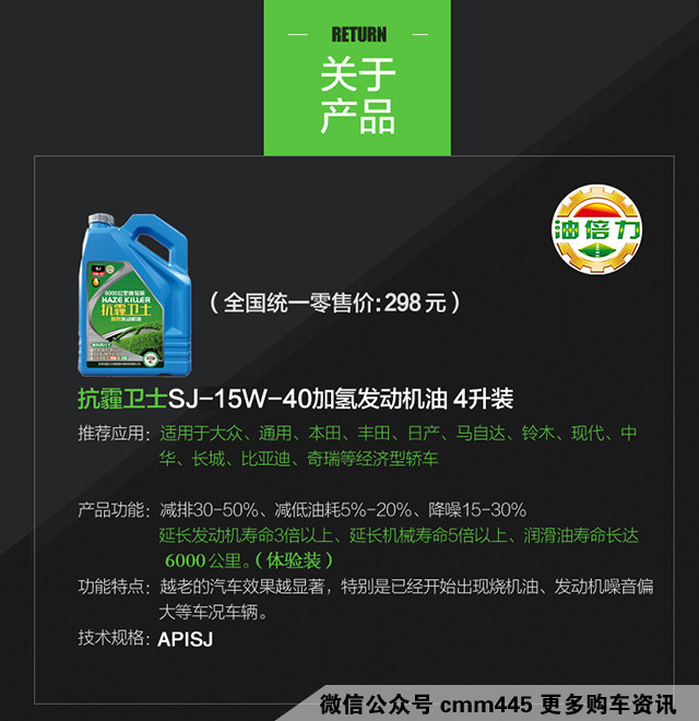 油倍力针对经济型轿车研制的油倍力抗霾卫士SJ-15W-40加氢环保节能型机油可以让已经有一定使用年限的车辆发动机效率得到显著的提升,碳排放可有效降低30%以上,并且在改善烧机油、耗油量变大和发动机噪音方面有着明显的效果。为什么抗霾卫士可以做到?因为机油基础油中的氢元素增多,可以大量脱除杂质以及机油中含硫、氮、氧等非烃类,充分饱和多环芳烃,机油的品质更加优秀。