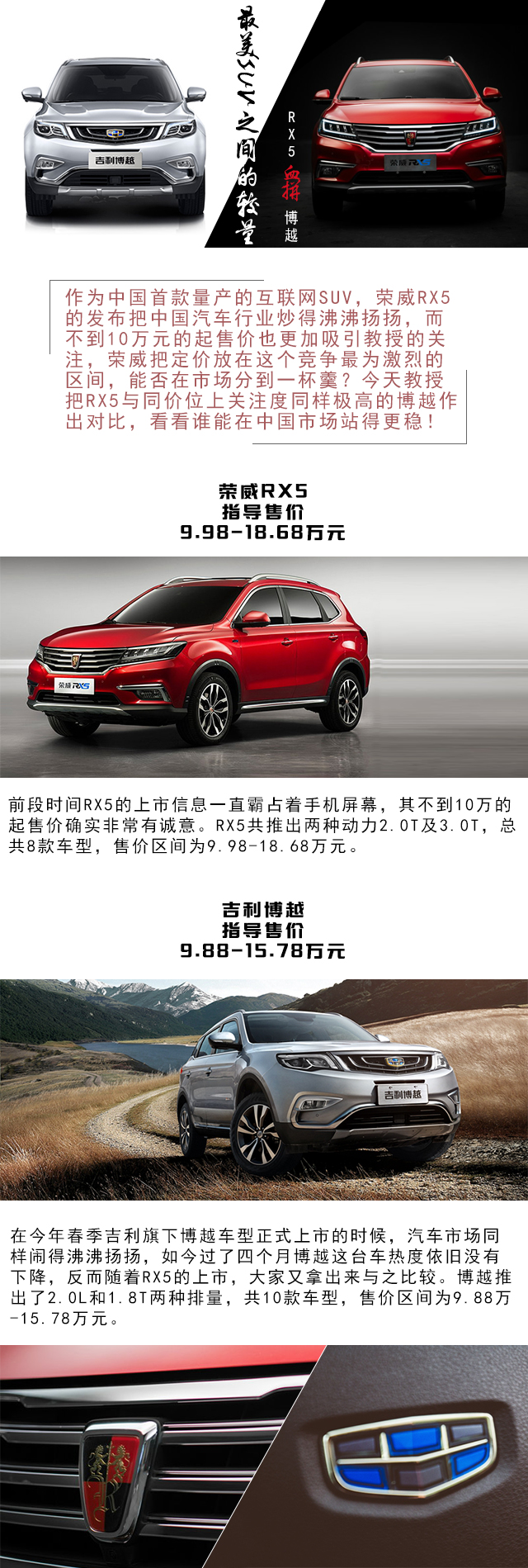 rx5油耗高一点、亮点是互联网。我觉得我会选择博越、毕竟它只是交通工具。一、省油是平民百姓心底不可忽视的防线。二、现在普通智能软件很普及, 车载互联网?真的很需要吗?反正我认为可有可无。我要的是好开又省油的车