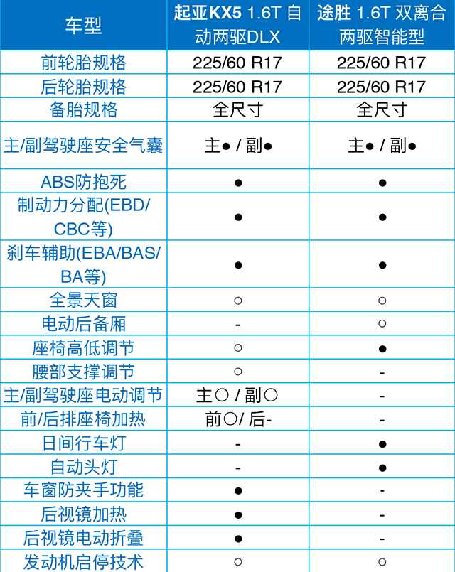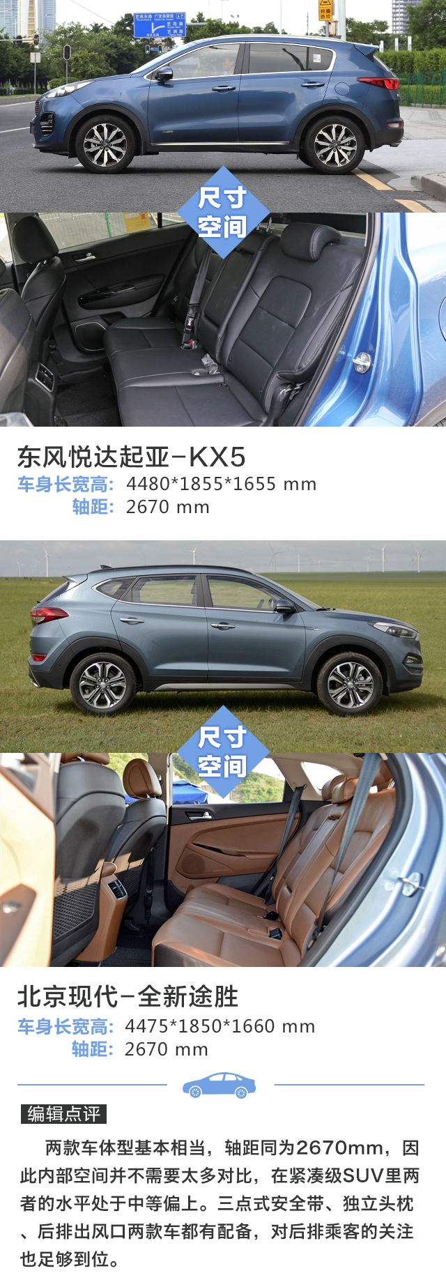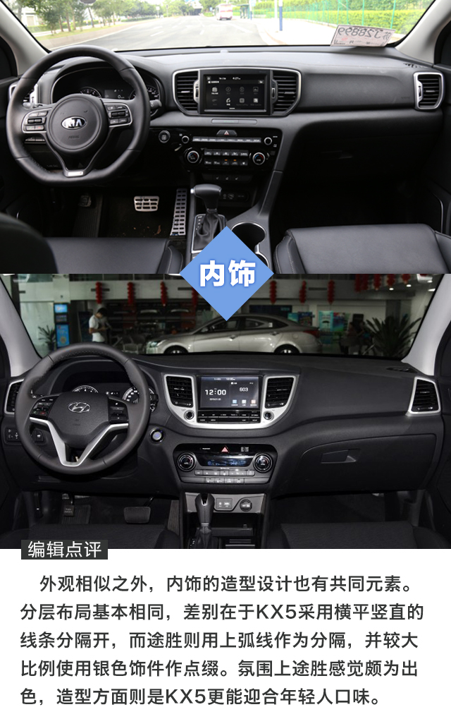 配置方面两款车型的差异各有千秋,这次教授找了价格最接近的两款配置进行对比。消费者比较喜爱的全景天窗两款车型都可以进行选装,途胜可以选装电动尾门。至于车内的舒适性配置,较为出奇KX5座椅高低调节需要选装才能实现,而途胜主副驾座椅并没有电动调节。