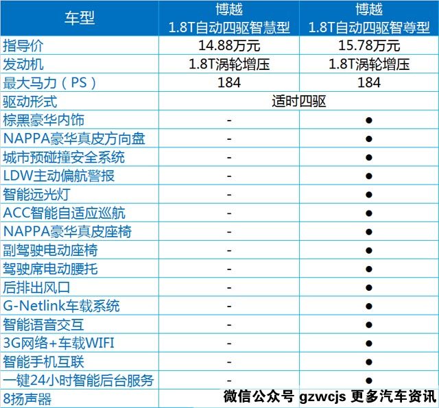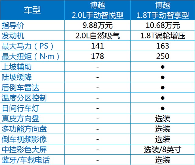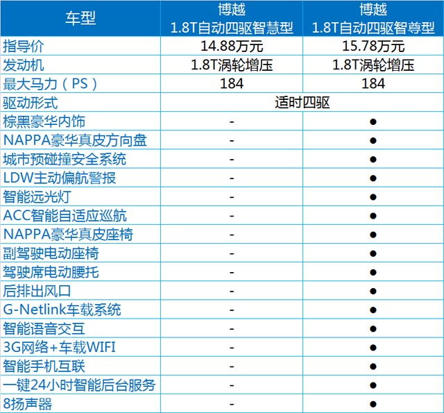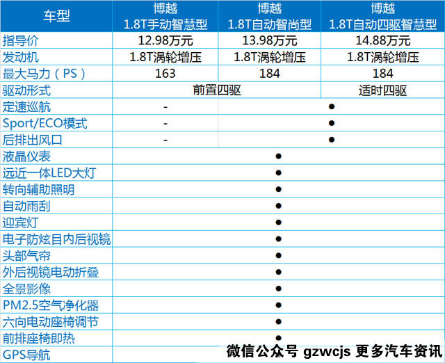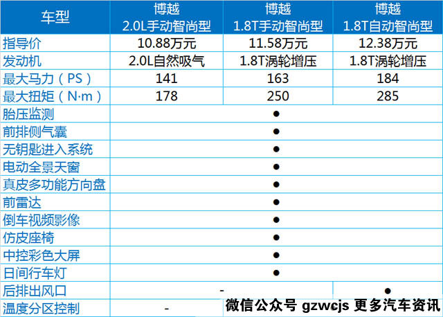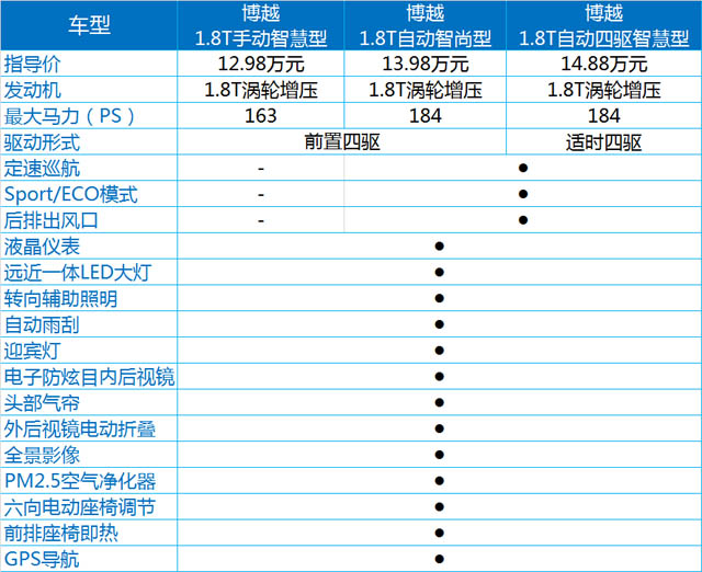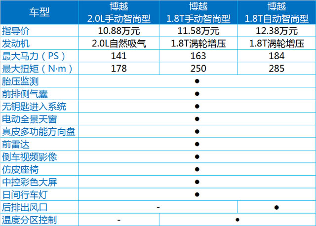 博越的智尚版有三款车型,三款车型的区别主要在动力配置上(见表)。而相对于最低配的智享型,智尚型的价格增加了10000-25000元,其中配置也增加了不少,如胎压监测、无钥匙进入、前雷达和倒车影像、中控大屏,等等,对于日常驾驶的便利和安全性,以及车内多媒体的娱乐功能都有所提升,重要的是,自动版的1.8T智尚型动力为高功率版,达到184PS,这也是它最贵的地方。