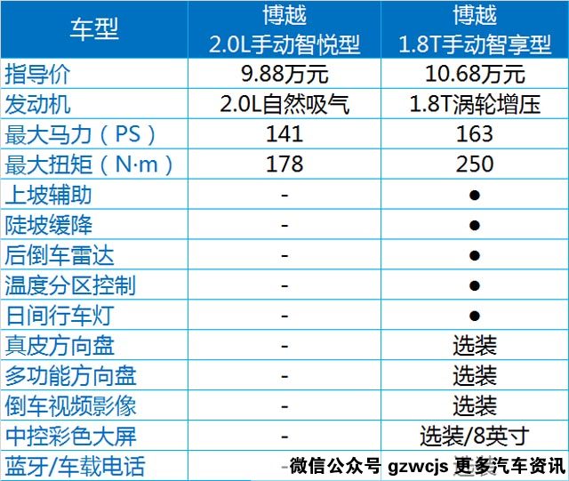 教授推荐:经过比较,教授最终推荐购买的车型为12.38万元的1.8T自动智尚型。首先第一点,这是价格最低的博越1.8T高功率版,提供184PS的马力,要知道博越也是个体型不小的SUV,这个马力其实也只能说是够用有余;其次就是这个车型的配置里,前排侧气囊有了、天窗有了、无钥匙进入有了、前雷达、倒车影像、日间行车灯都有了,可以说时下的家用车比较常用或者比较需要的一些配置都有配备了,免了日后加装的麻烦,宽且12.38元的价格比最低配贵了25000,不算很多,但是驾乘感受却是两回事了。