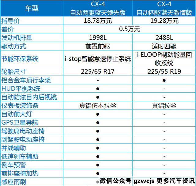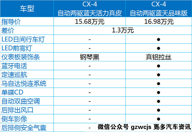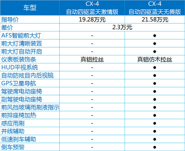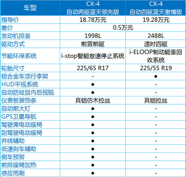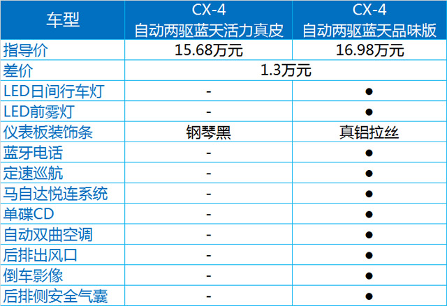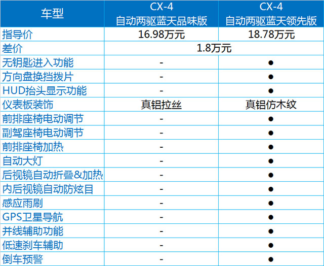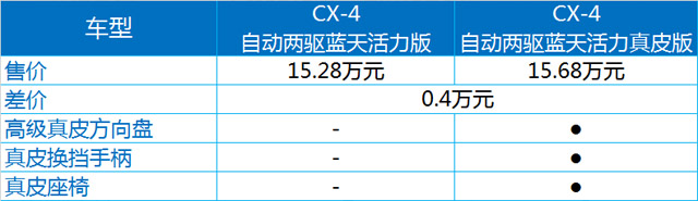 作为CX-4的最低配,蓝天活力版的车型有三款,其中刹车辅助、牵引力控制、车身稳定控制这些都毫无意外的成为标配,另外,前排侧气囊、无钥匙启动、电子自动驻车多功能方向盘、LED前大灯也都是标配,所以说即使最低配,CX-4的配置也已经够用了。而蓝天活力真皮版,顾名思义,是增加了一下真皮的材料,如真皮座椅、真皮方向盘、真皮换挡杆等等。