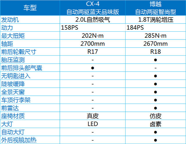 从对比结果不难看到,博越无论在内部还是外部配置都是比CX-4要丰富,而且博越的动力在数据上是比CX-4多了26PS。但是CX-4的优点在于创驰蓝天发动机对燃油经济型的控制,以及本身马自达对这种偏向于操控性的底盘调较也是颇有心得。而对于博越,很明显要论技术的话,吉利跟马自达还是有点距离,然而博越的悬挂调较本来就偏软,注重家用的舒适性,而且丰富的配置也让驾乘品质更加优秀了。所以总结来说,想感受优质的操控可以选择CX-4,如果是作为家用SUV的话,更加实惠的博越也许更加适合你,毕竟吉利的可靠性已经可以媲美合资品牌了。
