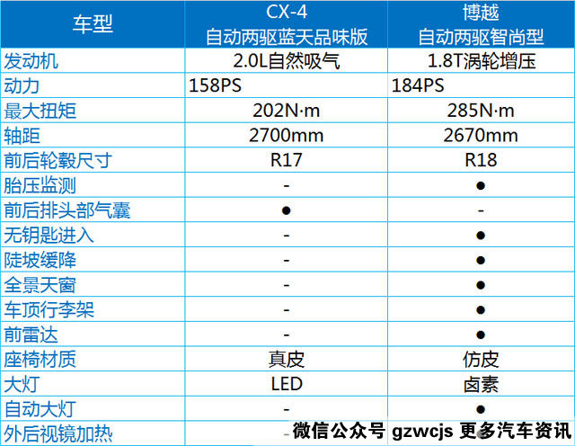 好了,来到今天的重头戏了,把两辆SUV的推荐车型进行对比,有人说教授是不是傻,居然把定价不同的自主SUV跟合资SUV拿来做对比,可比性不强吧。虽然两车的价格区间不一样,但是博越和CX-4 的产品定位其实是类似的,都走的是优雅的外观兼顾一定的性能的路线,而且最近自主SUV的进步也是有目共睹,所以我们就来比比看结果怎么样。