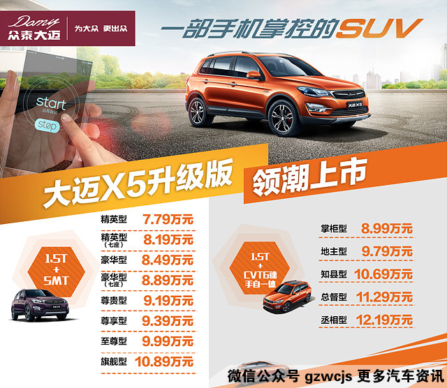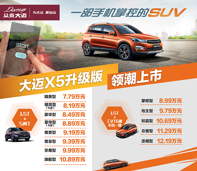 8月3日,2017款大迈X5升级版正式上市,新车搭载1.5T涡轮增压发动机并匹配5MT和CVT6速手自一体变速箱。此次共推出包含五座、七座在内的13款车型,官方指导价为7.79-12.19万元。发布会上,众泰大迈正式启用全新“Domy”标识并发布“为大众·更出众”的产品愿景。