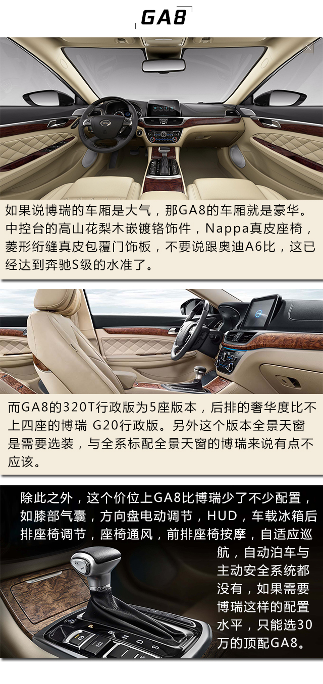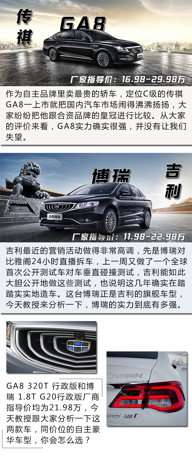 这些年来,自主品牌不断蓬勃发展,实力变得越来强越大,不少厂商开始推出C级豪华中大型轿车,开始叫板合资品牌C级车。今天教授把自主品牌中豪华轿车的佼佼者博瑞和GA8拿出来比较,如果让你选你会选哪一台?