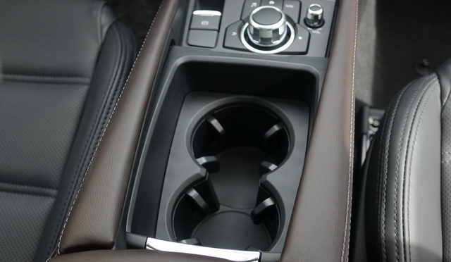 和老款对比,中央扶手位置的储物盒变成一个拉伸的软隔板,里面是两个杯架的设计。扶手箱空间不算大,但是里面配有两个USB接口和12伏充电接口,这些都是很实用的升级。