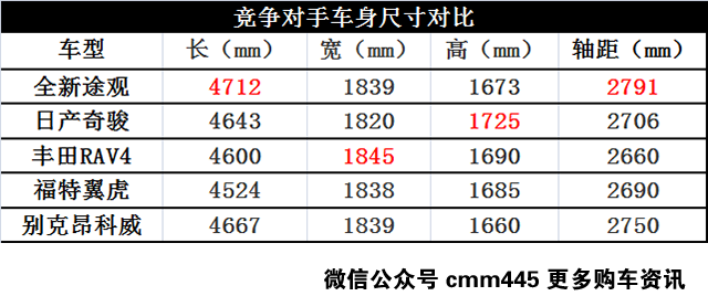 以车身尺寸和轴距跟竞争对手相比,车长和轴距方面有明显的优势,在同级中属于碾压的局势,轴距上更是达到了中型SUV尺寸的级别,要知道的是,汉兰达也才2790mm的轴距。至于实际的空间表现,还得等会实车出来,毕竟大众在空间上处理方式是以够用为方向。