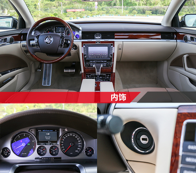 辉腾的内饰延续了大众车严谨的风格,除此之外,也在颇有艺术感。包括方向盘、中控台、车门内侧和出风口附近的木纹饰板,让内饰显得古典优雅。仪表盘依旧为两大圆三小圆的布局,惊讶辉腾居然不带无钥匙启动,也许是为了保留一些机械感吧。除了内饰的软质材料手感很好之外,犹如沙发般舒适的柏秋纳·弗洛座椅也是辉腾最吸引人的地方之一。