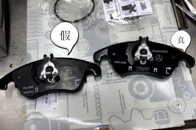 选择制动片时首先要看外观与做工,下图中右边的制动片明显比左边的制动片做工要好,无论是字体的印刷,还是边缘做工的圆润,都要优于左边的。