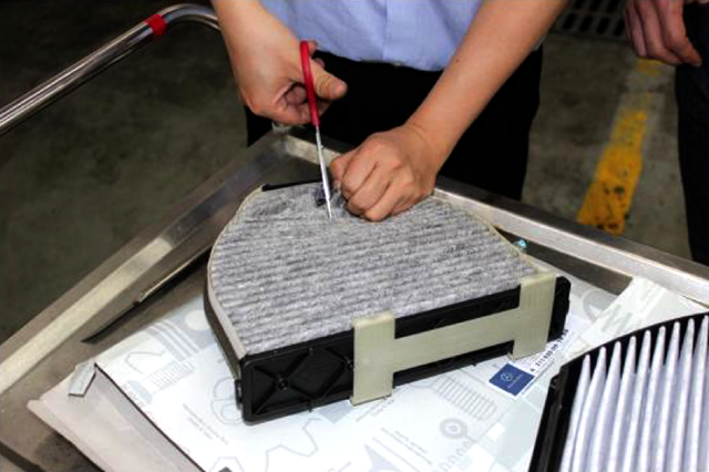 最有效辨别空调滤清器的方法就是剪开它,这里就由教授来帮您剪开,车主们就别费劲了,购买原厂的就行了。剪开后可以观察到滤网内部的用料,对比之下就能够很明显看出,原厂的空调滤清器多了一个纳米纤维层,而且黑色颗粒的密度要大很多,说明原厂的空调滤清器不仅有着更高的过滤效率,还更加耐用。