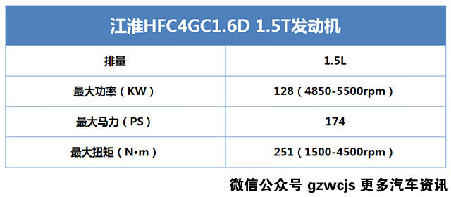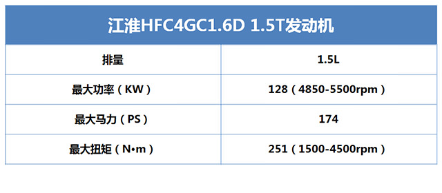 江淮也是一个拥有研发发动机的能力,一台代号为HFC4GC1.6D的1.5T涡轮在13年12月实现了量产,加入了缸内直喷和DVVT双进排气可变气门正时系统让其在动力参数表现方面突出,处于国产自主研发的发动机的高等水平,另外使用了霍尼韦尔涡轮增压器,在1000rpm是无论已经介入工作,而在1500rpm时已经达到最大扭矩点,发动机整体表现相当不错,而且油耗也控制在一个合适的范围。