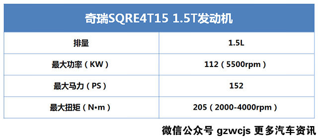奇瑞旗下的1.5T涡轮增压发动机代号为SQRE4T15,以此前艾瑞泽7上代号为ACTECO-SQRE4G16的1.6L自吸发动机开发而来,采用了DOHC双顶置凸轮轴并且配有双VVT可变气门正时技术,依旧使用了多点电喷的方式。发动机的动力参数属于中上水平,在日常驾驶中能满足日常需要,但是发动机峰值扭矩范围依旧不够宽广。