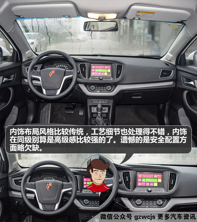 内饰方面,荣威360的内饰布局比较传统而严谨,材料主要是硬质塑料,但从细节上体现出接缝等工艺处理的很好,能赶上合资品牌。中控台通过金属饰条点缀,为荣威360的内饰增添更多生机。配置方面,牵引力控制和车身稳定控制都不能全系标配,略感可惜,而另一方面,后倒车雷达为全系标配,这一点则比同级别的自主品牌对手要优秀,另外倒车影像也能在大部分车型里找到,蛮方便的配置。