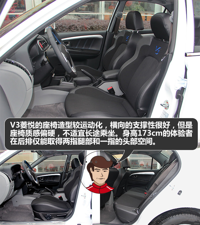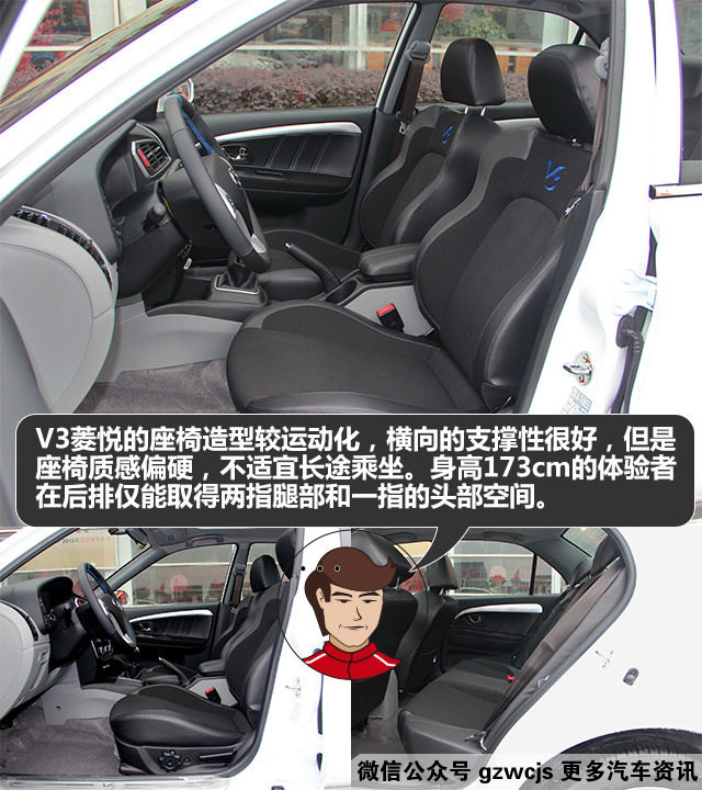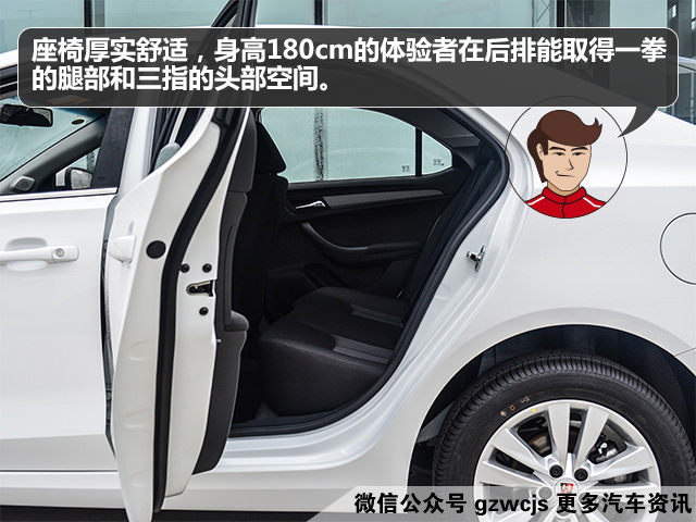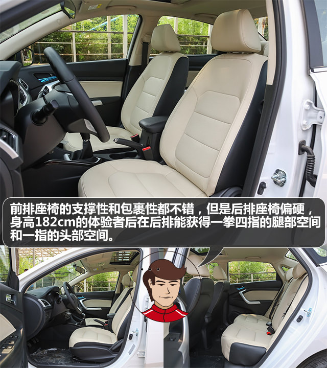 座椅方面分为织物和仿皮两种材料,填充物相对较单薄,质感比较生硬。身高173cm的体验者在后排仅能取得两指腿部和一指的头部空间,实在有点局促,但考虑到该车2500mm的轴距,也就不会对这样的空间表现而惊奇了。