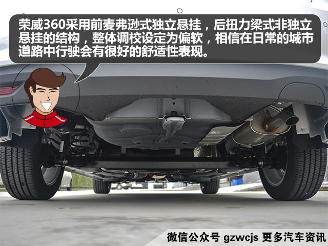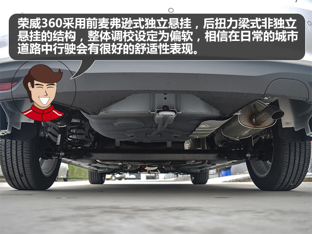 荣威360采用前麦弗逊式独立悬挂,后扭力梁式非独立悬挂的结构,整体调校设定为偏软,底盘对震动的处理比较到位,同时该车的噪音控制很好,在车内只能听到轻微的路噪和风噪,提供了一个静谧的车厢环境。