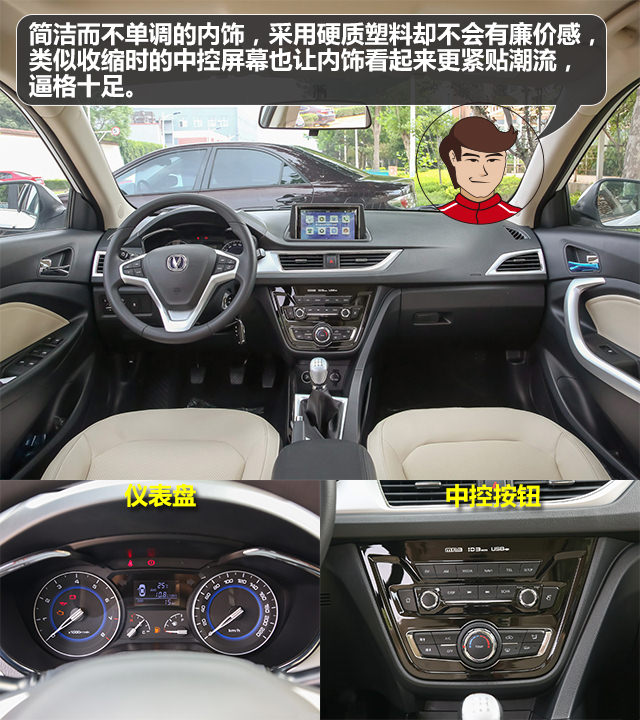 内饰的设计简约却不单调,纹理清晰的中控台材料为硬质塑料,质感不会太廉价。中控面板加入了更有高级感的钢琴烤漆材料,旋钮的阻尼适中,手感不错。中控屏集成了导航、倒车影像等功能,还支持多种音源的输入,可以看出悦翔V7的配置已经跟上主流水平了。