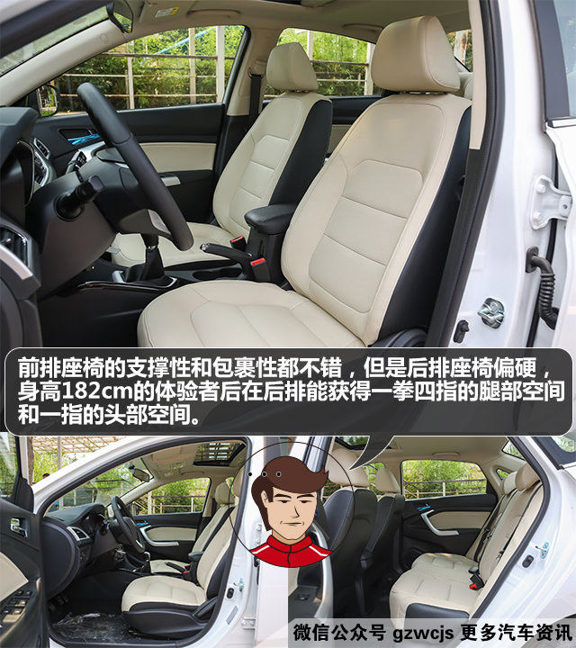 前排真皮座椅的侧面包裹性和肩部的支撑性都很好,乘坐舒适性不错。但是后排座椅的质感却很硬,中间座位跟没有头枕,后排舒适性确实欠佳。身高182cm的体验者后在后排能获得一拳四指的腿部空间和一指的头部空间,空间表现中规中矩吧。