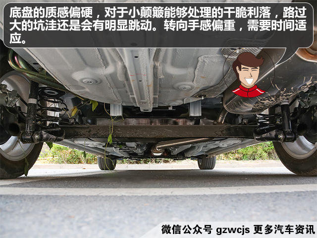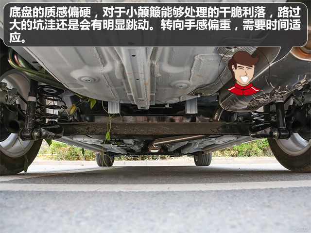 底盘的质感偏硬,对于小颠簸能够处理的干脆利落,但是经过较大的坑洼或者减速带时,车子的跳动会比较明显,影响舒适性。值得注意的是手动挡车型的方向盘为机械液压助力,自动挡车型的方向盘为电子液压助力,手感相对电子助力都会偏沉。