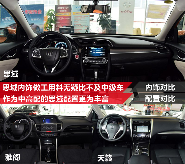 或许本田厂家为了迎合国内的热门车型价格区间,只好把大部分经费都用在研发外观造型以及动力总成上面,思域的内饰做工用料确实一般,相比于雅阁和天籁真的是没法比,毕竟中级车营造的风格是车内豪华舒坦。配置方面,乞丐版的中级车配置只能说够用,而思域的配置就颇为丰富,像电动座椅调节、中控大屏导航、自动空调等。