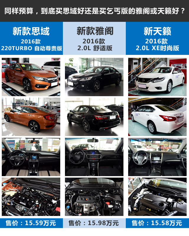 教授的朋友最近十分纠结,手里握着买新思域的预算,但是迟迟还没下手,原因有两个,第一,买新思域(自动尊贵型15.59万)的预算足够买一台乞丐版的新雅阁(2.0L 舒适版 15.98万);第二,朋友准备跟相恋多年的女朋友准备订婚,以后还打算生几个娃呢,思域的乘坐空间感觉不够用。