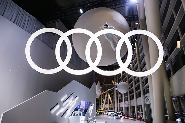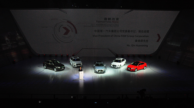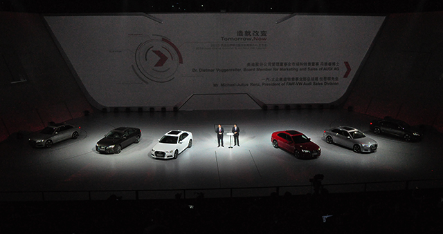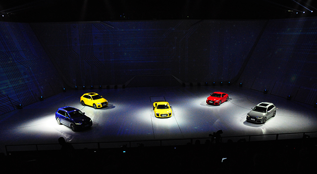 万众期待的全新奥迪A4L从一个充满未来设计感的多边形空间出现在我们面前,一种领先时代的未来感骤然而生,未来,好似触手可及。共6辆不同颜色的顶配车型整齐排列于舞台中央,将全新奥迪A4L的产品亮点都一一展现给我们。