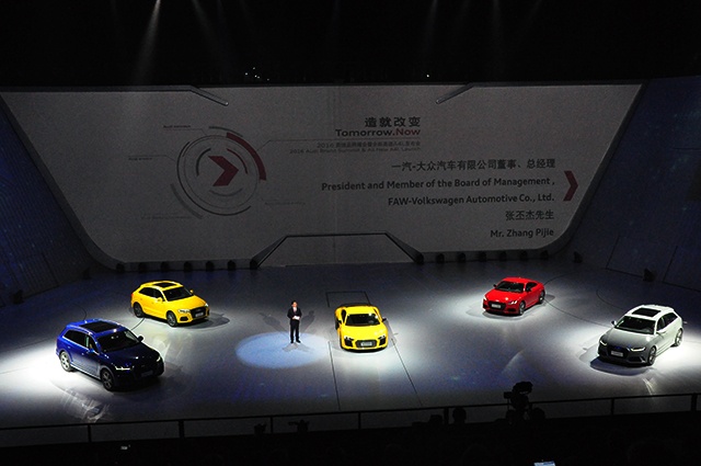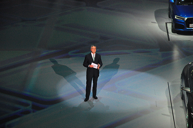 晚会迎来了开场,主持人介绍完到场嘉宾和领导后,一段关于奥迪全球107年的历史长河片段随即入侵教授的脑细胞,让教授深刻地了解了奥迪的品牌魅力。随后奥迪股份公司管理董事会主席施泰德先生出来致辞,讲述了一系列关于未来科技产品和技术等,期间一众亮点车型出场,包括TT Coupe,Q7 NF,Q3 PA,RS6 AVANT,R8 V10 Coupe Performance。