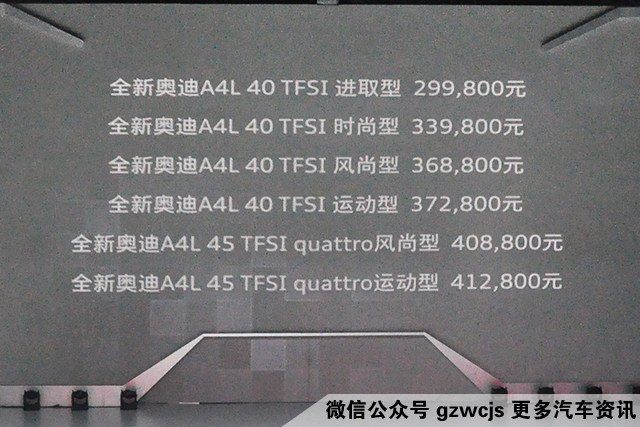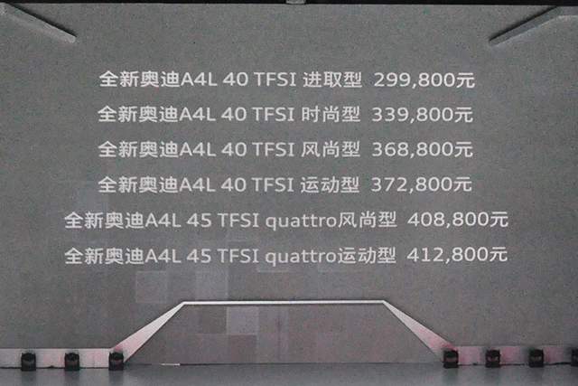 重要时刻来临了,发布会上最后由一汽-大众奥迪销售事业部执行副总经理荆青春先生公布了全新奥迪A4L的售价,6款车型售价尽显眼前,鉴于豪华品牌在B级车市场上争夺多年,此次全新奥迪A4L的售价配合其公布的配置看,真的是性价比高于其他老对手,就拿主力车型2.0T低功率版本时尚型车型来说,相比同级竞品车型而言,全新奥迪A4L增加了导航、真皮座椅、奥迪特有的Connect系统等高成本配置,入门产品更全都采用前后五连杆式独立悬架,比同价位级别其他品牌车型的多连杆独立悬架更增加了舒适性,又没减轻灵活性,在操控和舒适装备上遥遥领先同级,而在发动机上,无论低功率版本还是高功率版本,都比同级竞品拥有更优化的动力系统,实惠配置教授实在细数不过来,看来奥迪是准备了一款诚意满满的产品来打动消费者,对中国市场的重视更进一步,至此,全新奥迪A4L上市发布会亦告一段落。